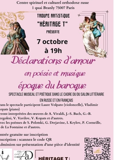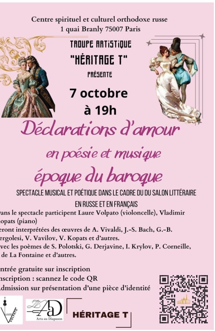 Nous vous invitons à l’ouverture de la saison du Salon littéraire et musical présenté par la troupe artistique HERITAGE T. Cette saison s’ouvrira par un spectacle poétique et musical consacré à l’époque baroque.